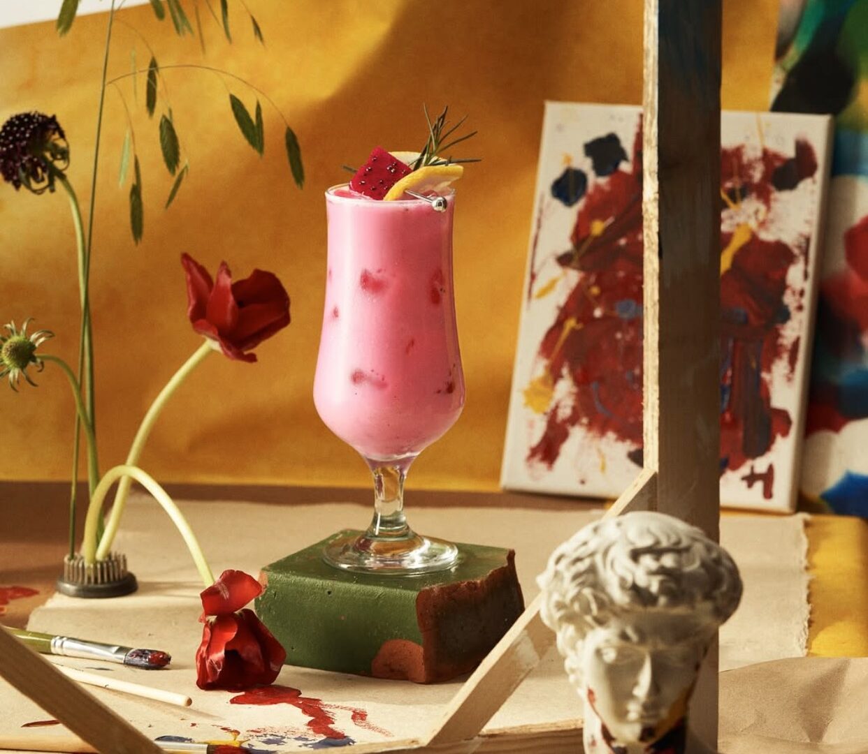 Thanh long hồng mộng rót vào men Yakult như đang kể chuyện tình mùa hè, chanh leo thì lén lút chen ngang với cú chạm “nắng gắt”, may mà bạc hà kịp lao ra “giải cứu” trả lại sự mát rượi cho tâm hồn.